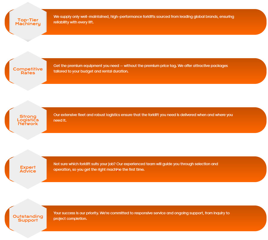 Provide high-quality forklifts and equipment that enhance operational efficiency and safety. Deliver customer-focused rental, sales, and maintenance services with consistency and care. Build long-term partnerships by ensuring reliability, transparency, and value in every solution. Continuously innovate and adopt sustainable practices to support a greener future in logistics and industry.